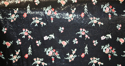 EMBROIDERED FLORAL LACE FABRIC WITH BEAD SPARKLE BLACK RED ROSES 56" WIDE BY THE YARD