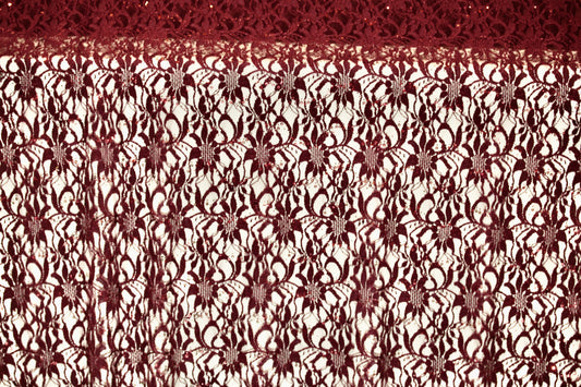 EMBROIDERED FLORAL LACE FABRIC WITH BEAD SPARKLE BURGUNDY 58" WIDE BY THE YARD