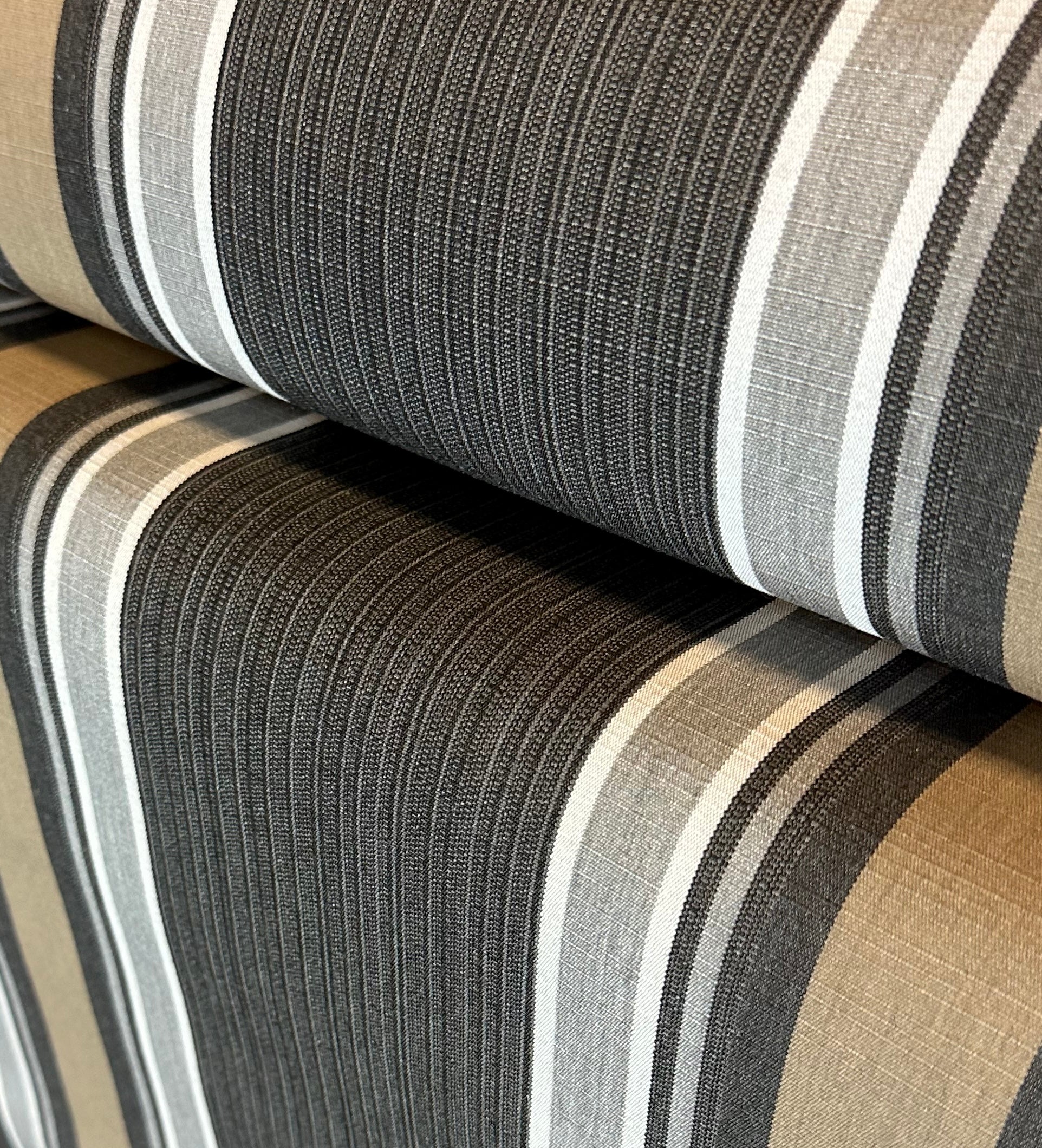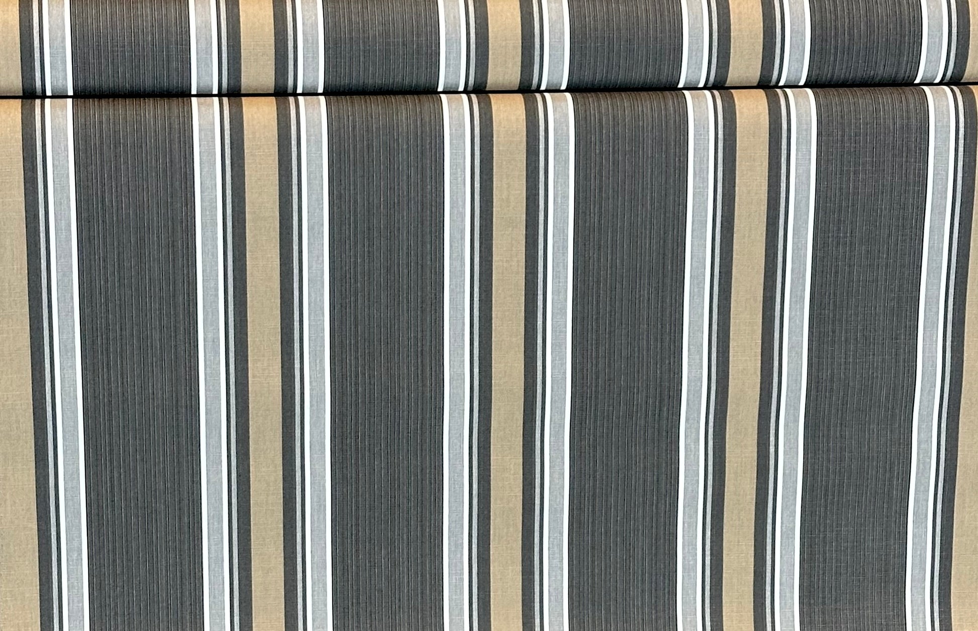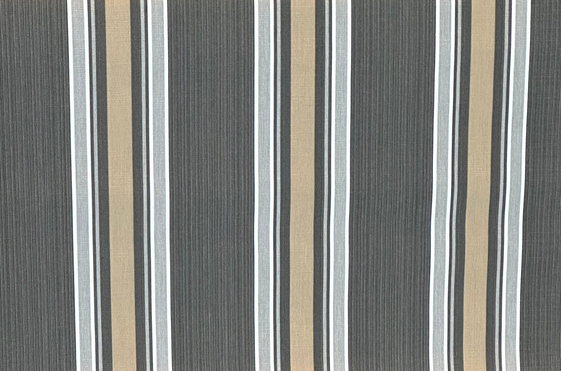 Vertical Stripes in shades of dark beige, charcoal, grey and white, center mixed stripe is charcoal with undertones of dark beige