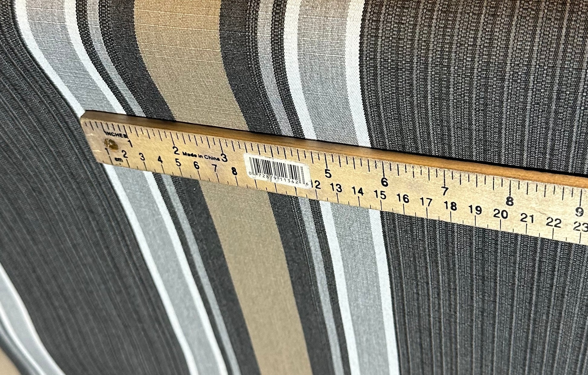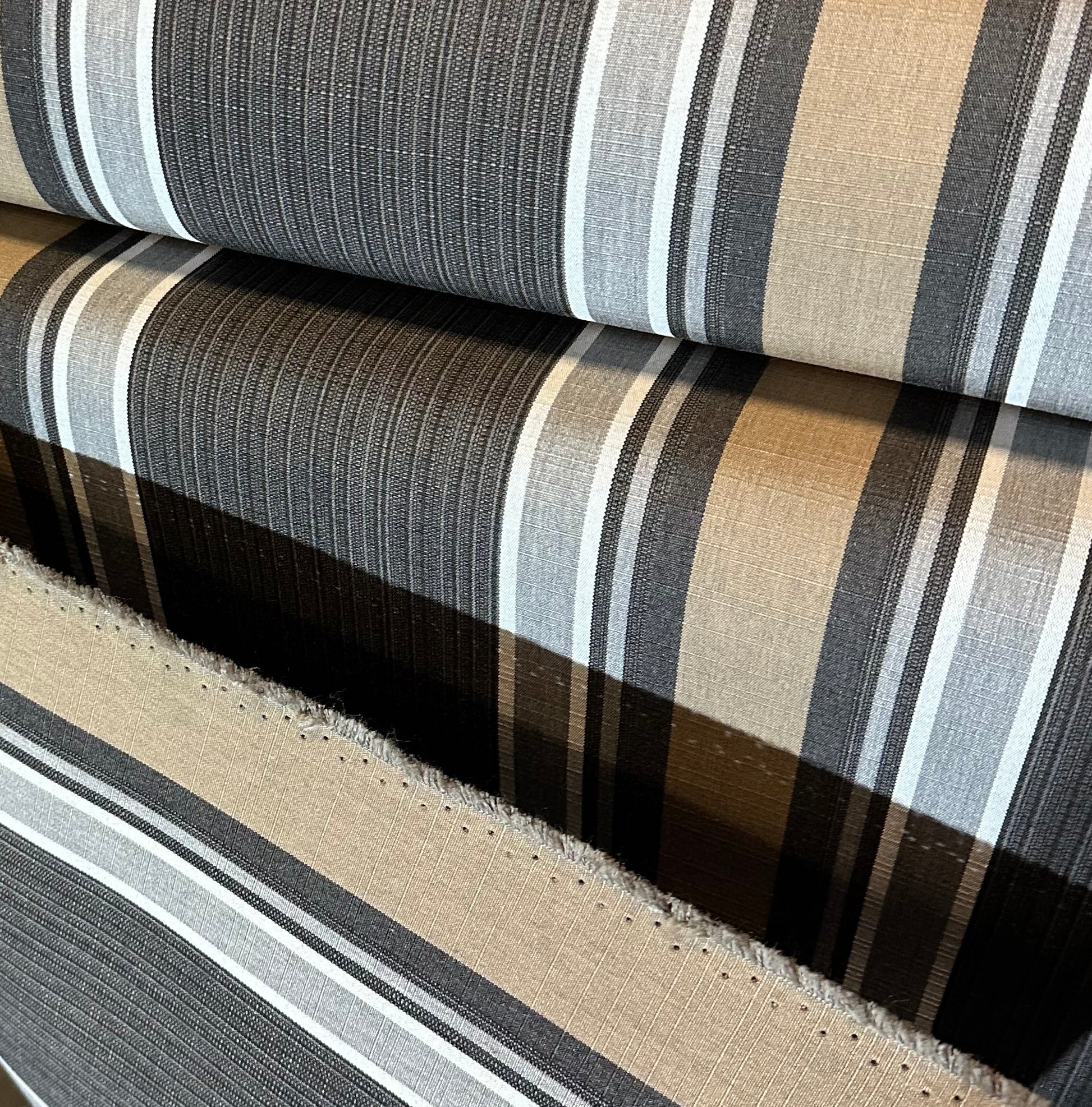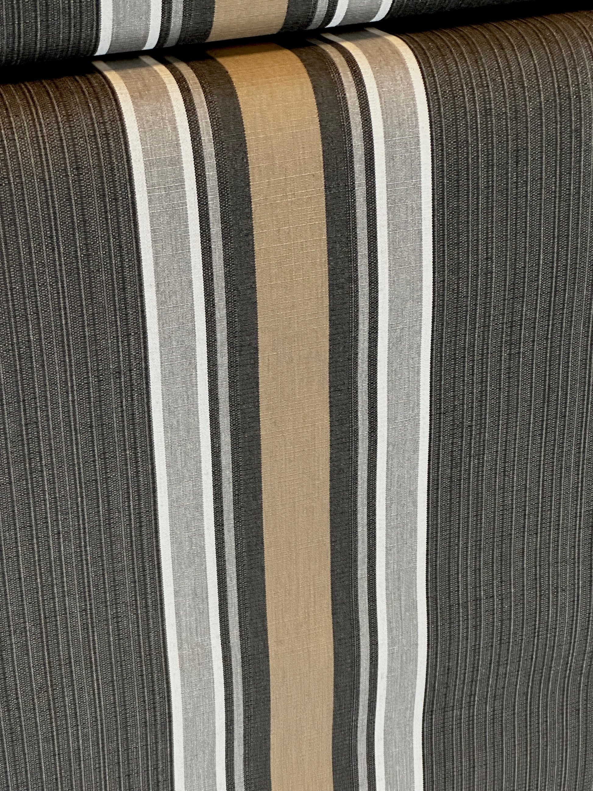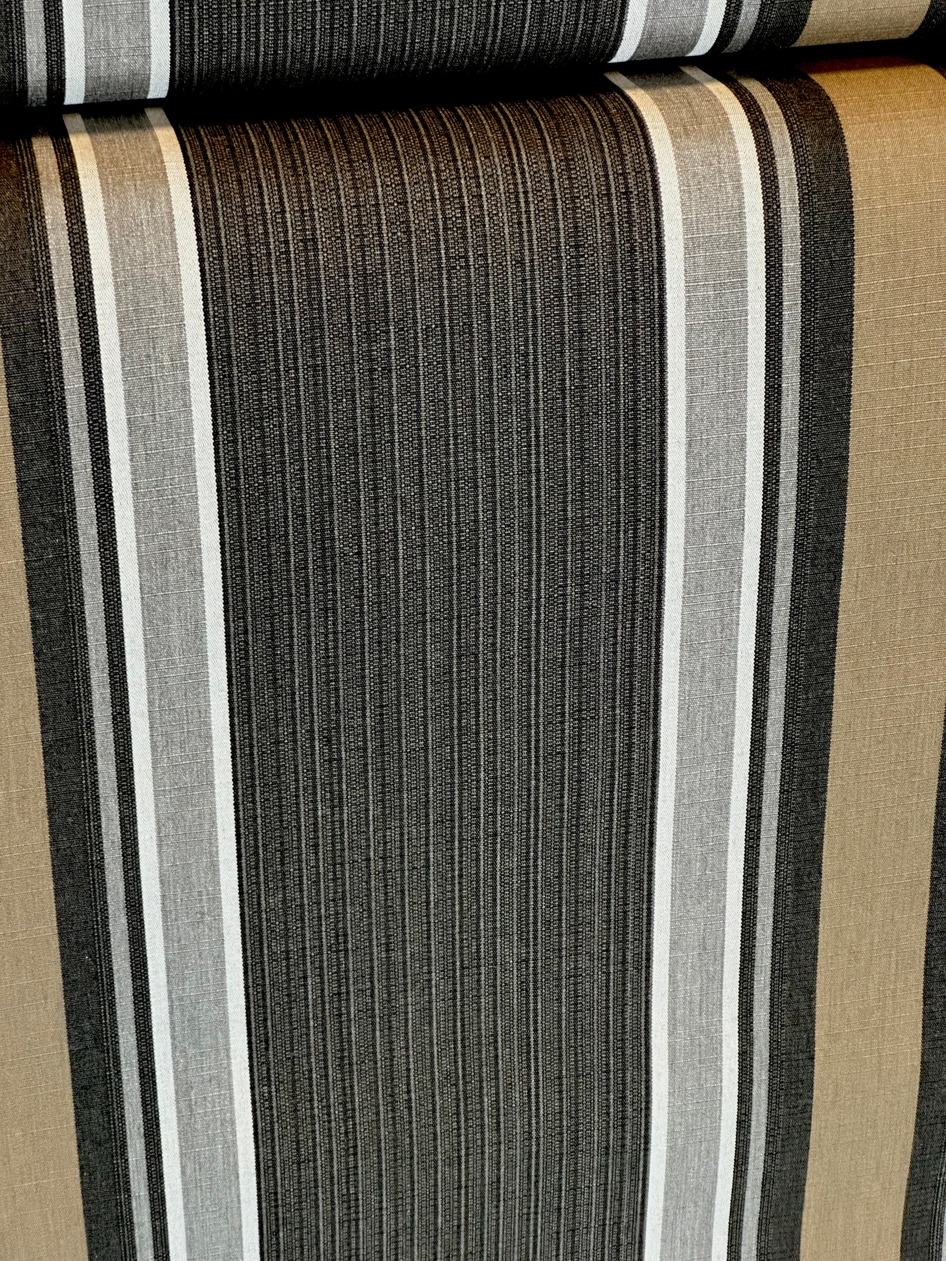 Vertical Stripes in shades of dark beige, charcoal, grey and white, center mixed stripe is charcoal with undertones of dark beige