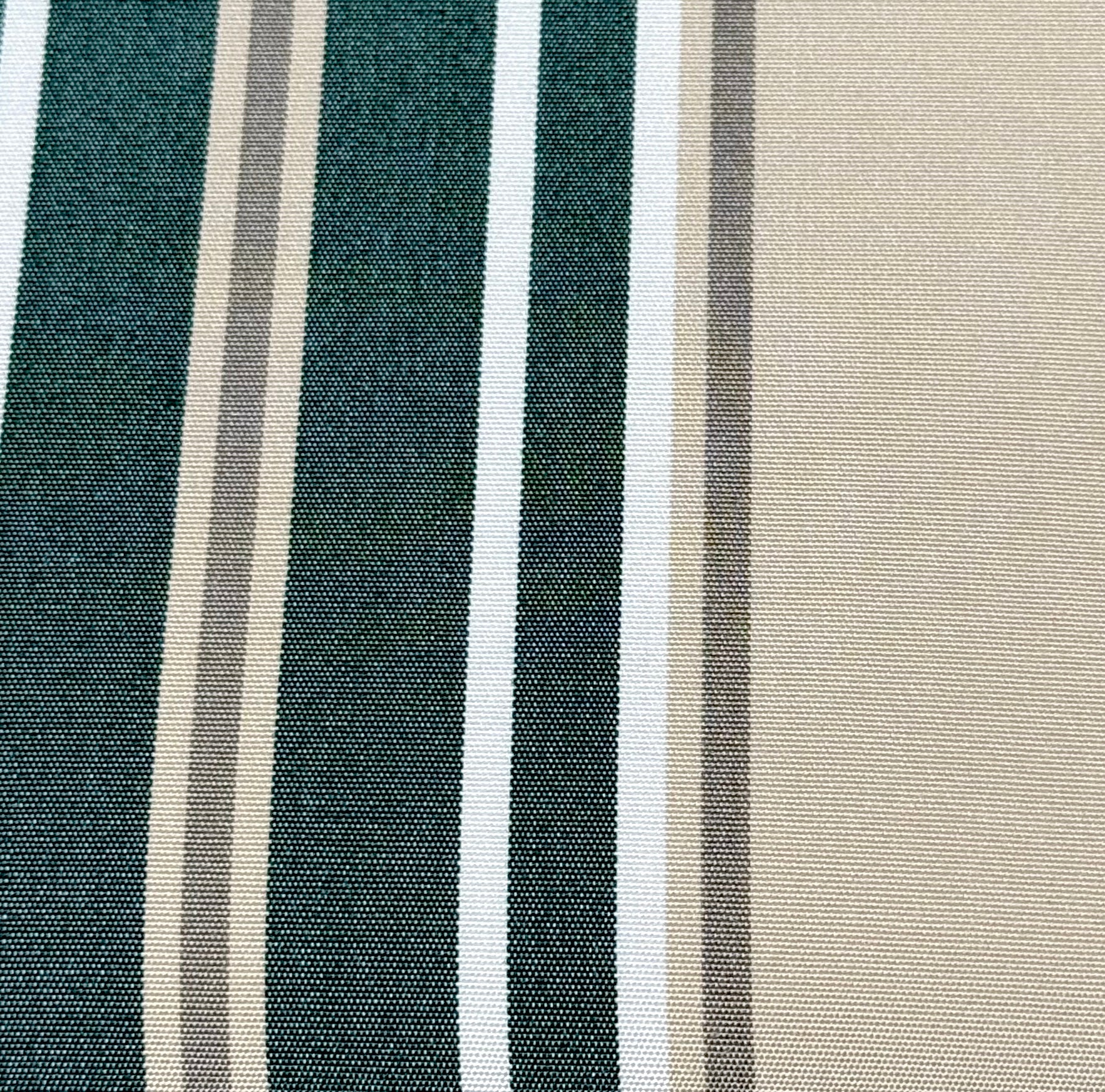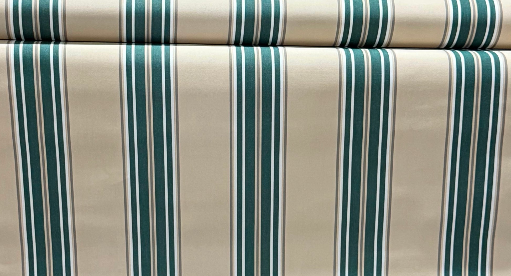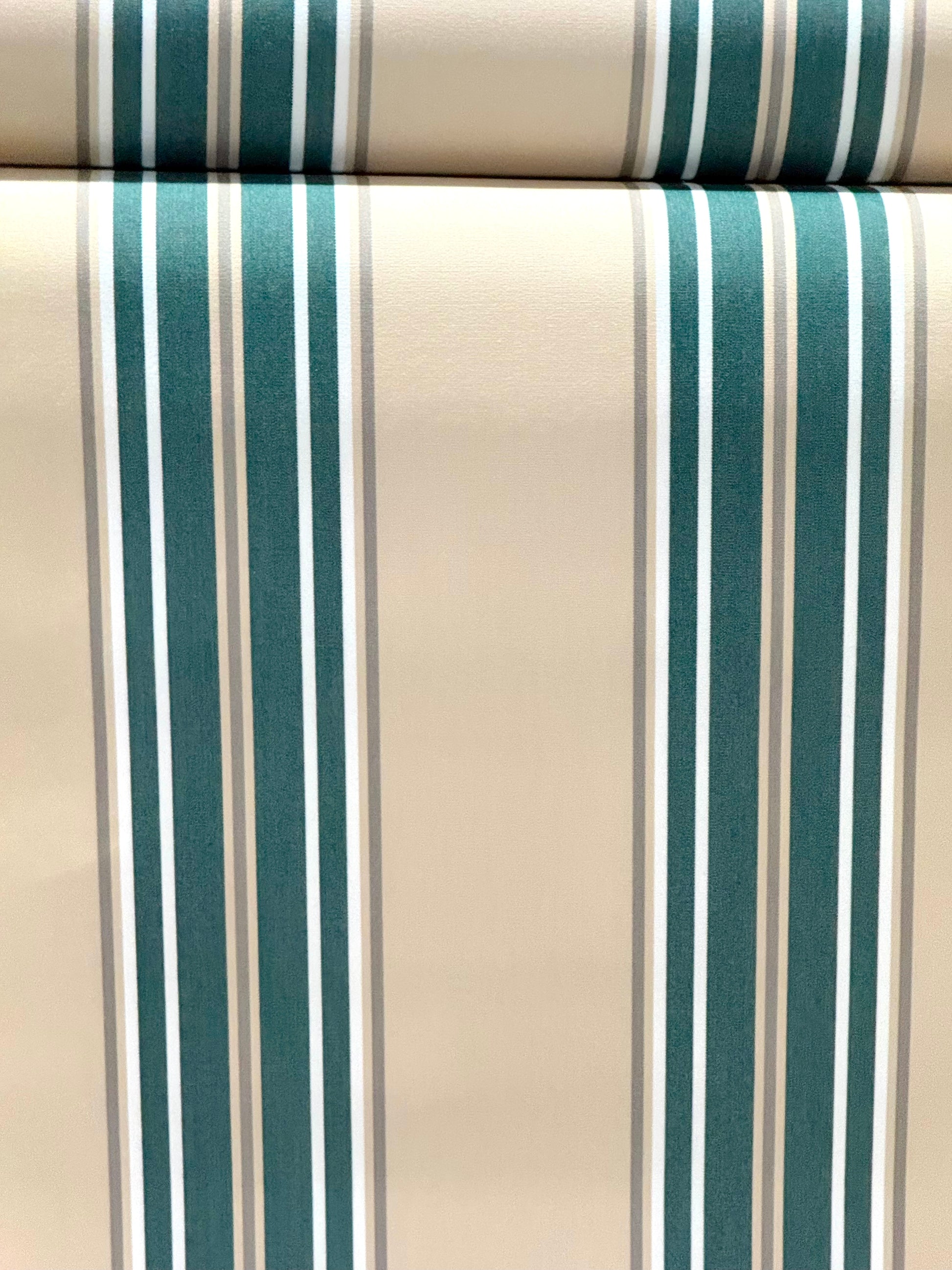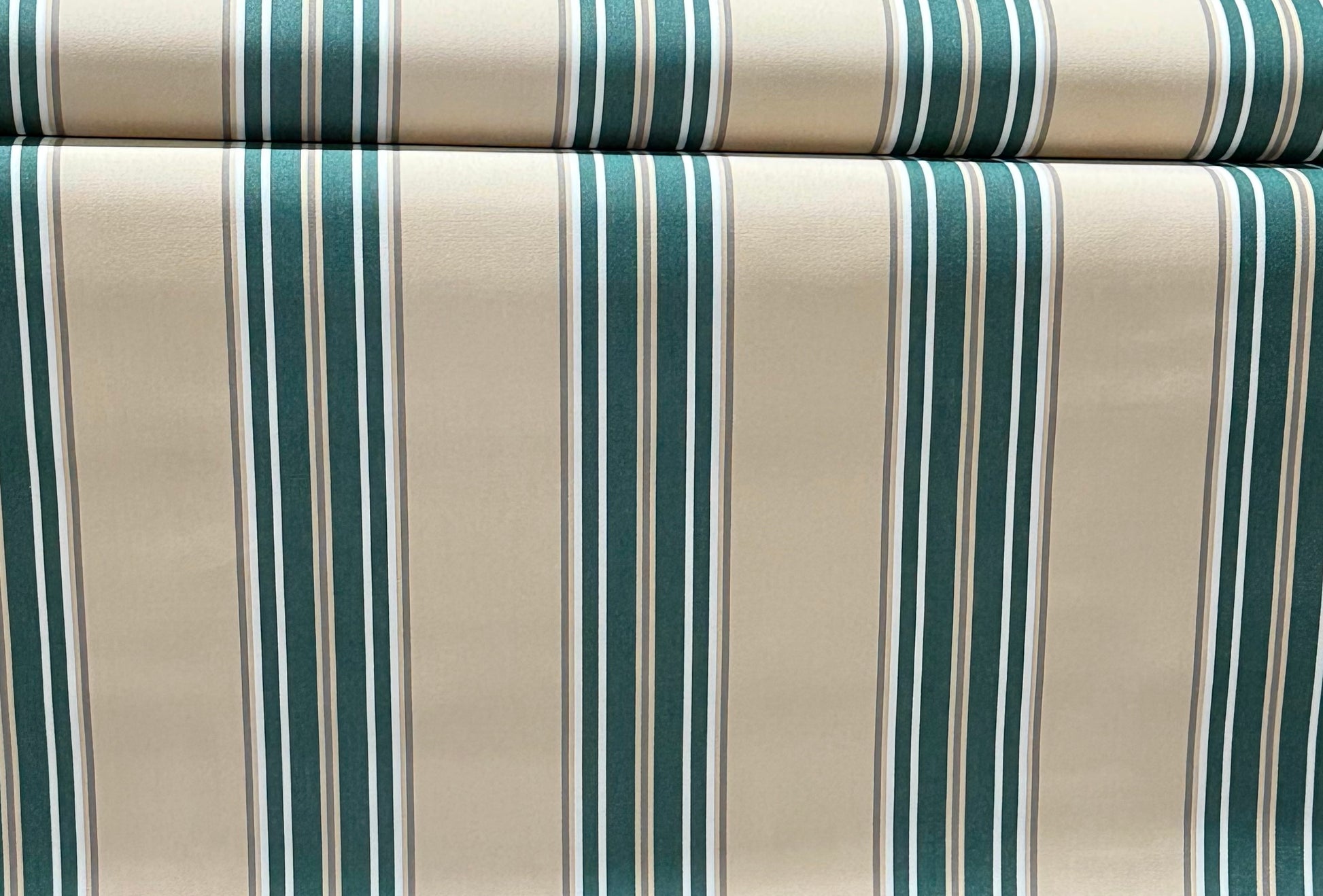 Vertical Stripes in shades of beige with forest green stripes and taupe and off white pinstripes with a 9" (22.86cms) repeat